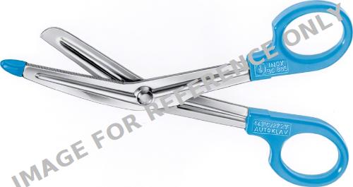LISTER Bandage- and Cloth Scissors (Universal Scissors), angled to side, serrated (inside), 1 blade probe pointed, 145 mm (5 3/4"), handle: blue, plastic handles