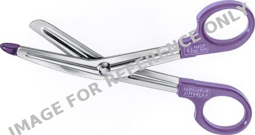 LISTER Bandage- and Cloth Scissors (Universal Scissors), angled to side, serrated (inside), 1 blade probe pointed, 145 mm (5 3/4"), handle: violet, plastic handles